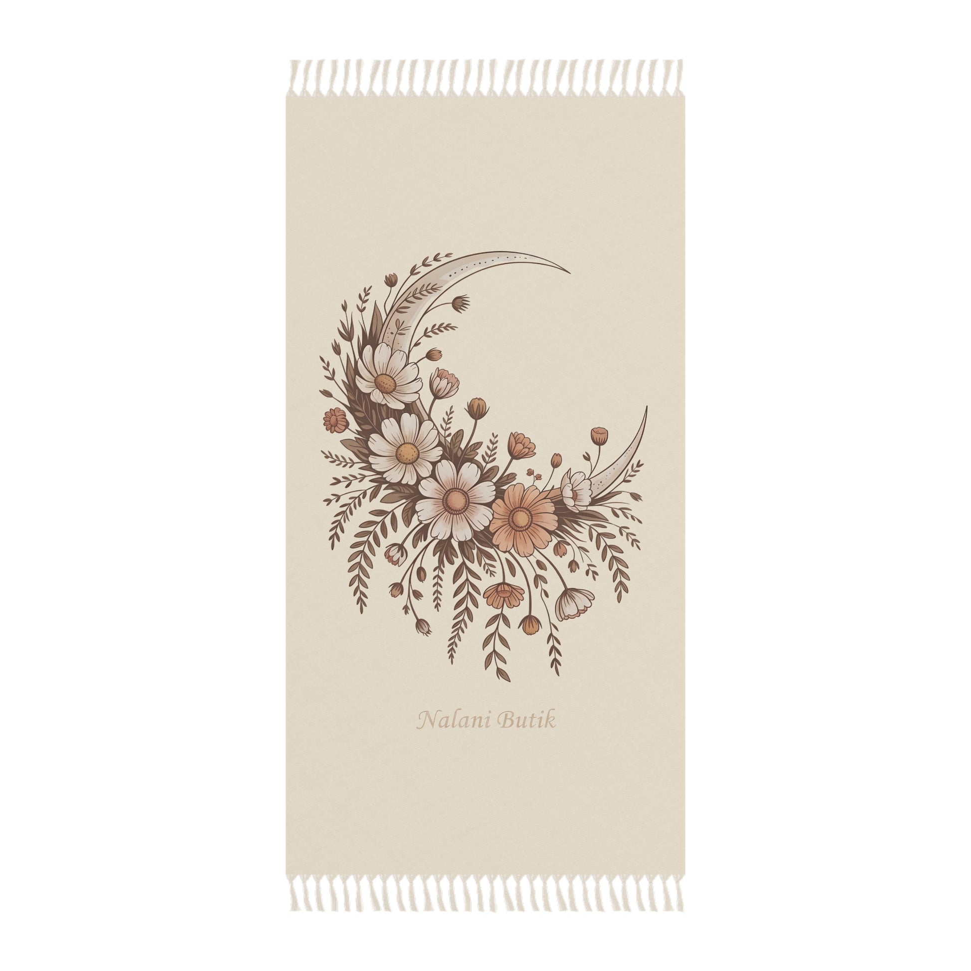 Soft, sun-warmed and quietly bohemian — this beach cloth brings a gentle, vintage floral crescent to your moments by the water and beyond. Lightweight polyester lets it fold small for a daypack or suitcase, yet it opens out to a generous 38" × 81" canvas for lounging, wrapping, or layering over a picnic blanket. The muted earth-tone daisies and trailing foliage curve into a crescent moon, giving the piece a calm, handcrafted feel that pairs with salty air and slow afternoons. Knotted tassels edge the cloth, adding tactile charm that catches the breeze. It dries fast, keeps colors bright after many uses, and moves easily from beach towel to travel throw or hammock cover when you need simple comfort with a boho touch.