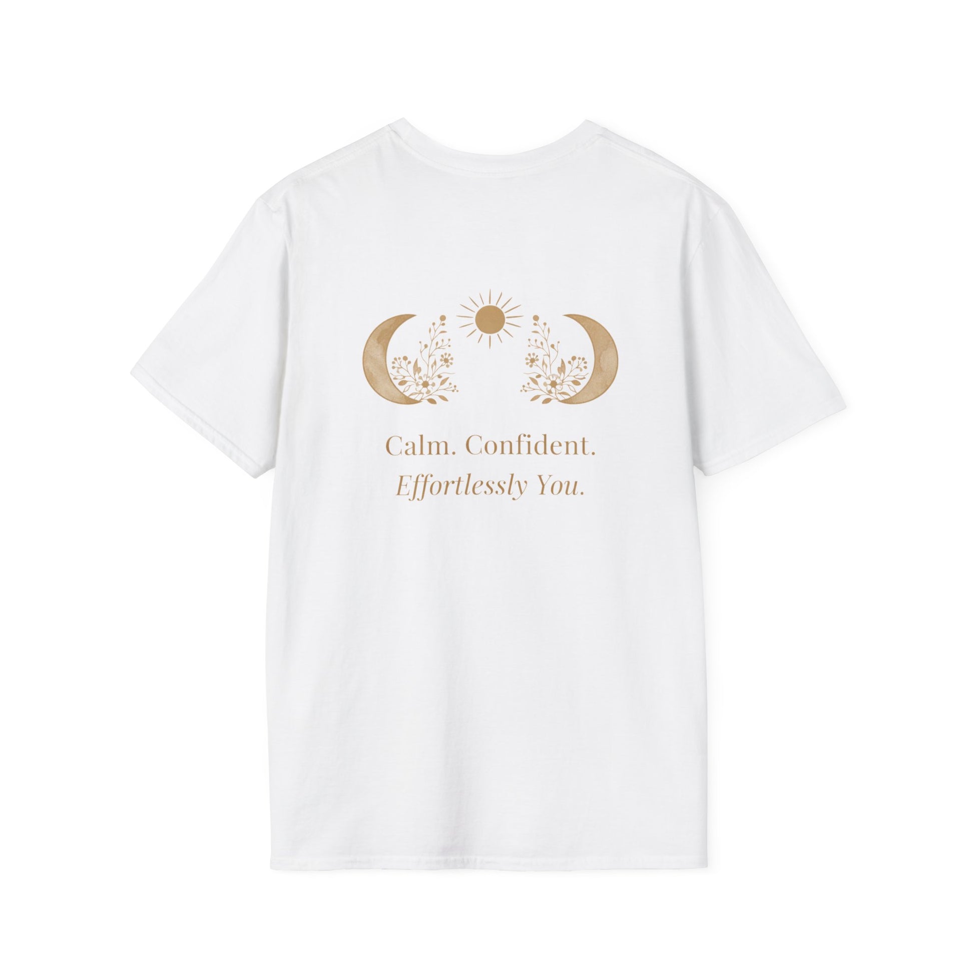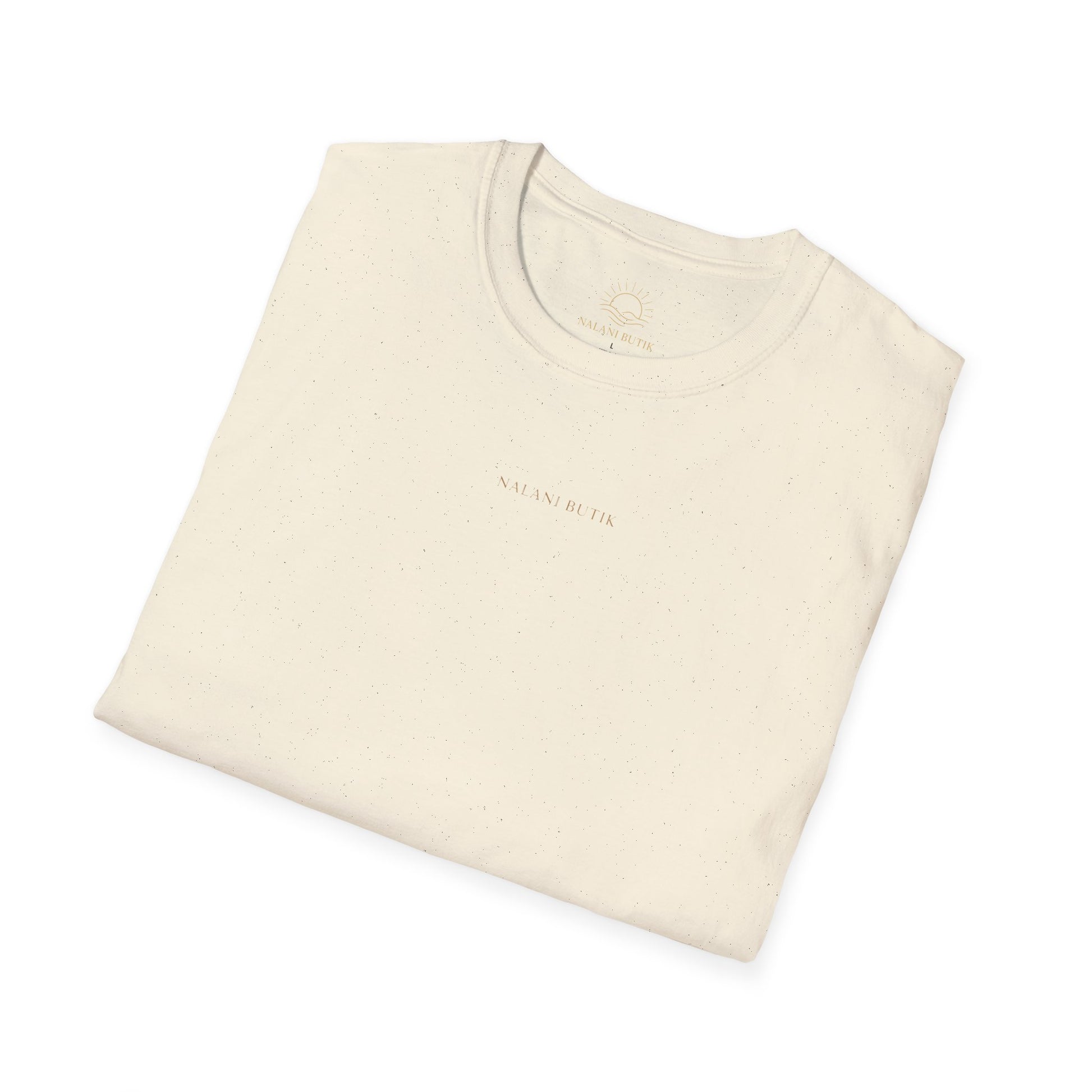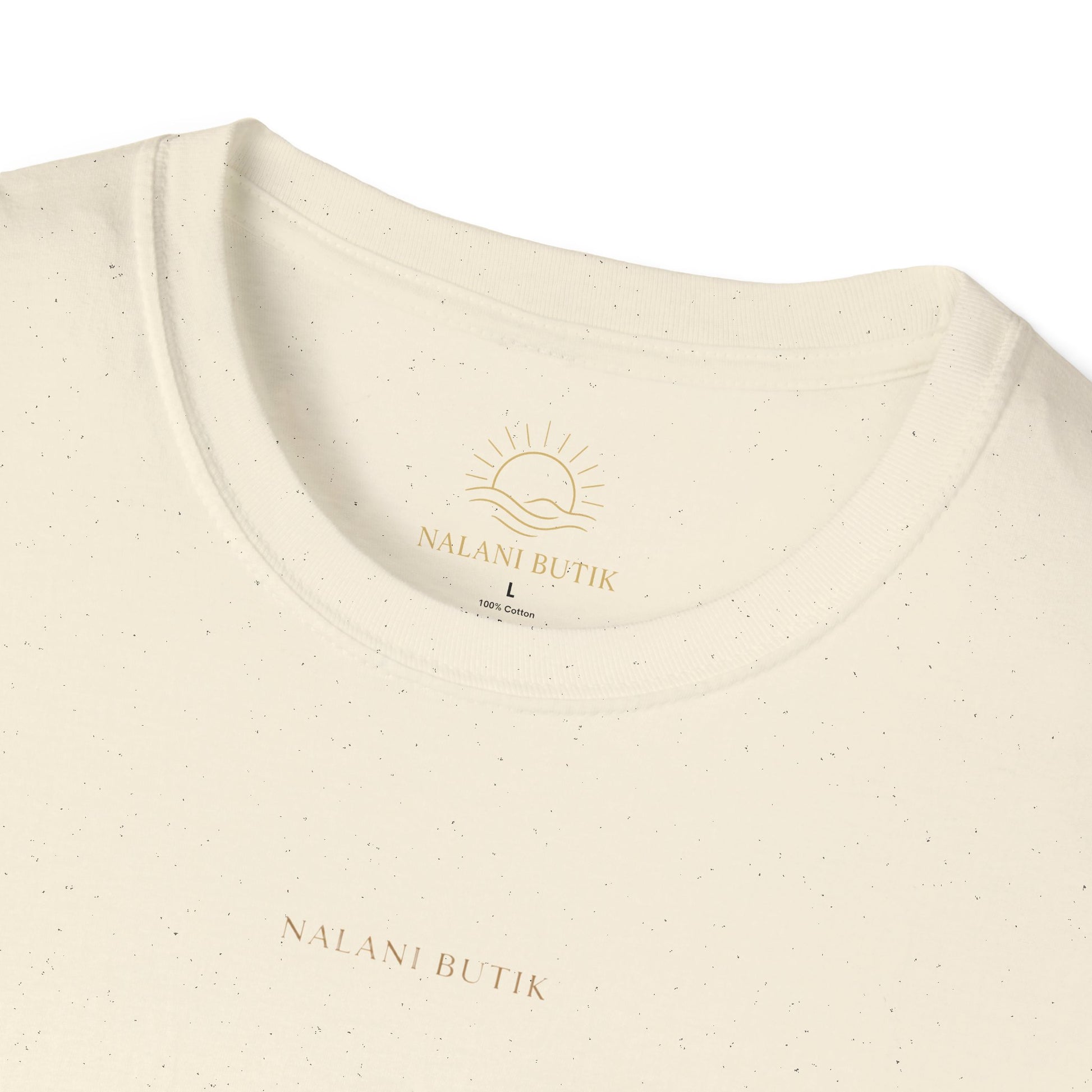 This lightweight cotton t-shirt is designed for everyday comfort with quiet intention. Crafted in a warm, speckled ivory tone, it features subtle NALANI BUTIK lettering centered beneath the neckline and a moon phase back print with delicate floral details and the affirmation: