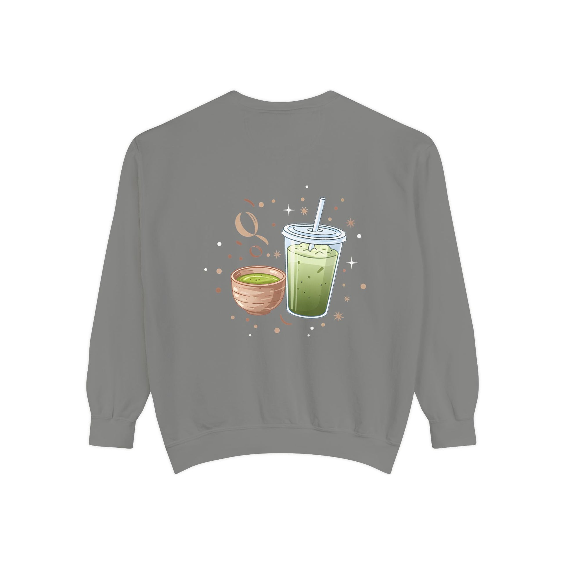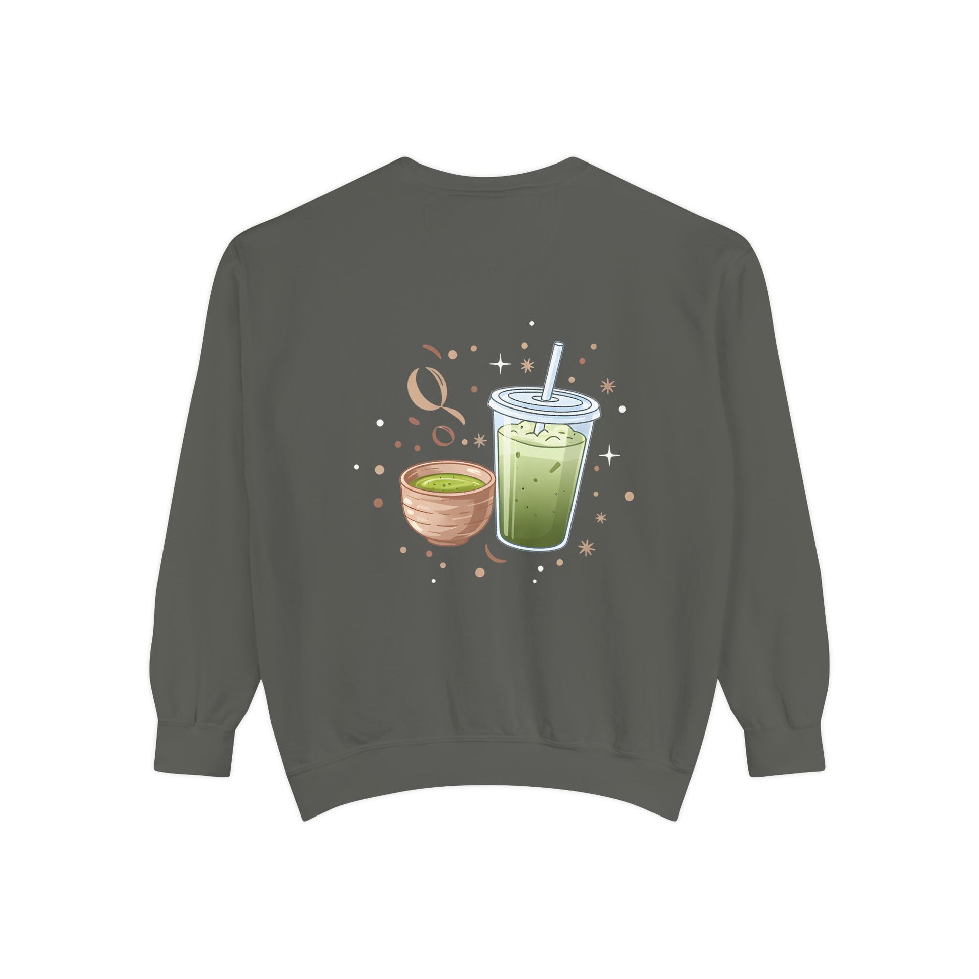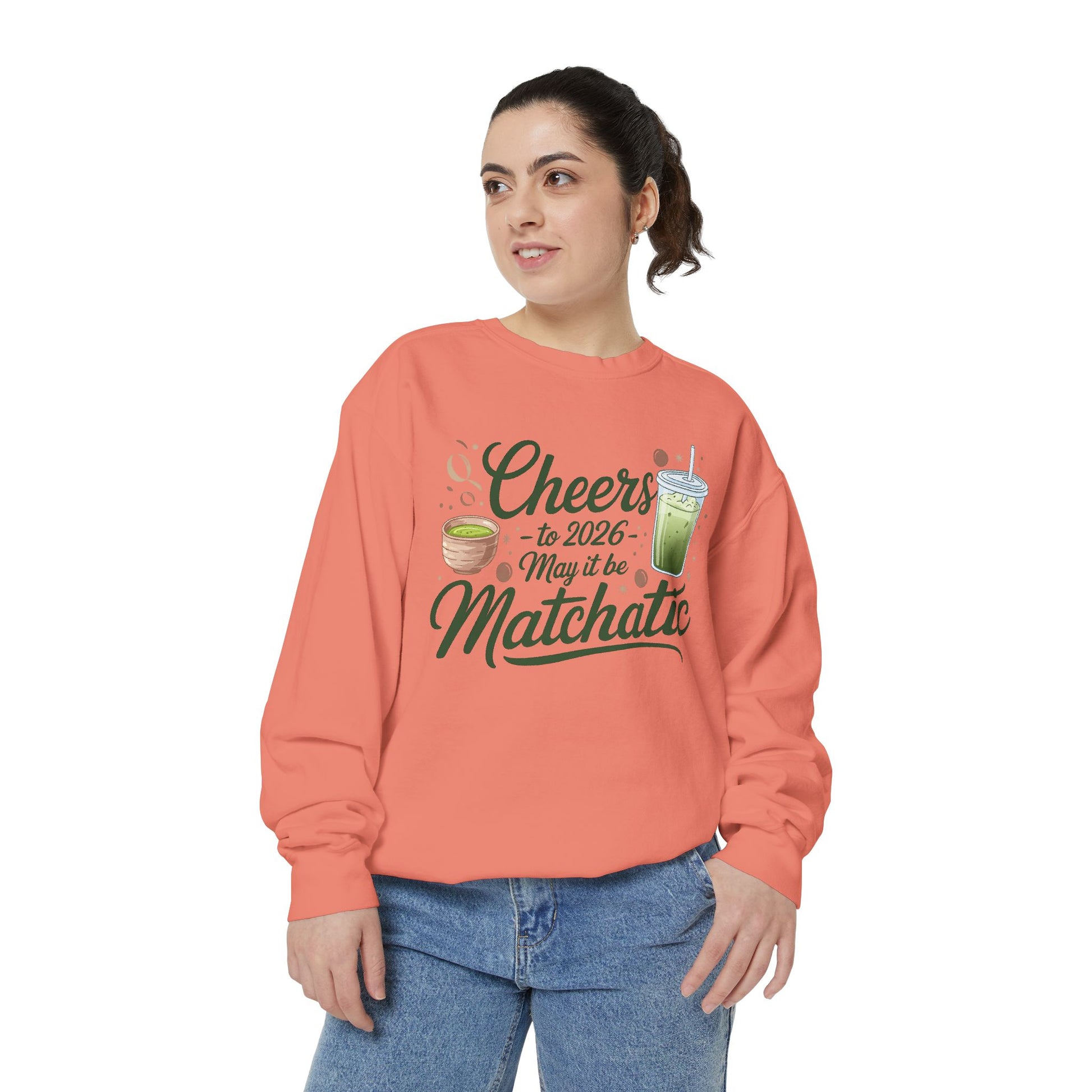A cozy unisex garment-dyed sweatshirt with the text 'cheers for 2026 - May it be Matchatic' in front and two matcha cups with confetti in the back. Perfect for matcha lovers celebrating the new year. Suitable for adults, this medium-heavy fabric sweatshirt is a relaxed fit with embroidery decoration options.