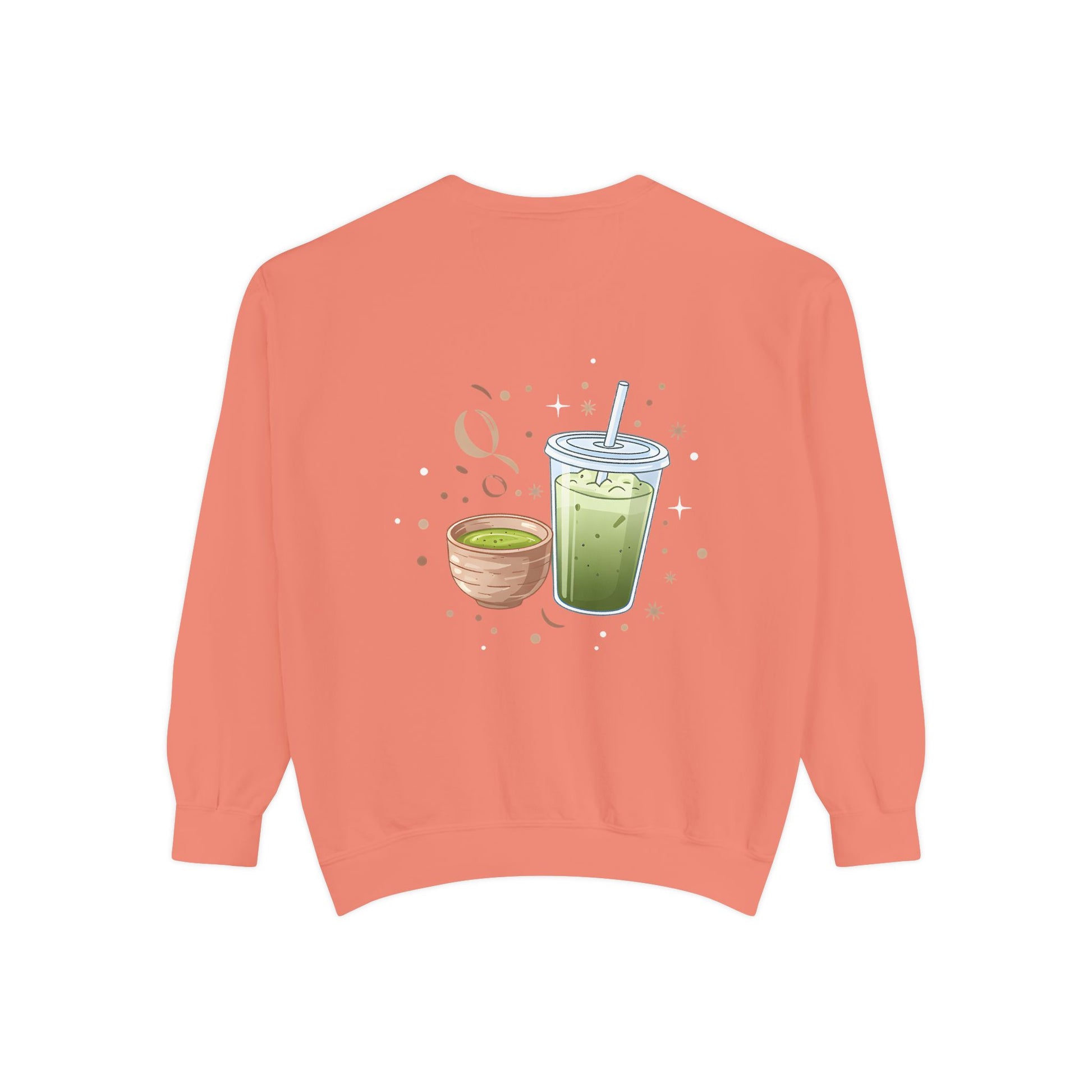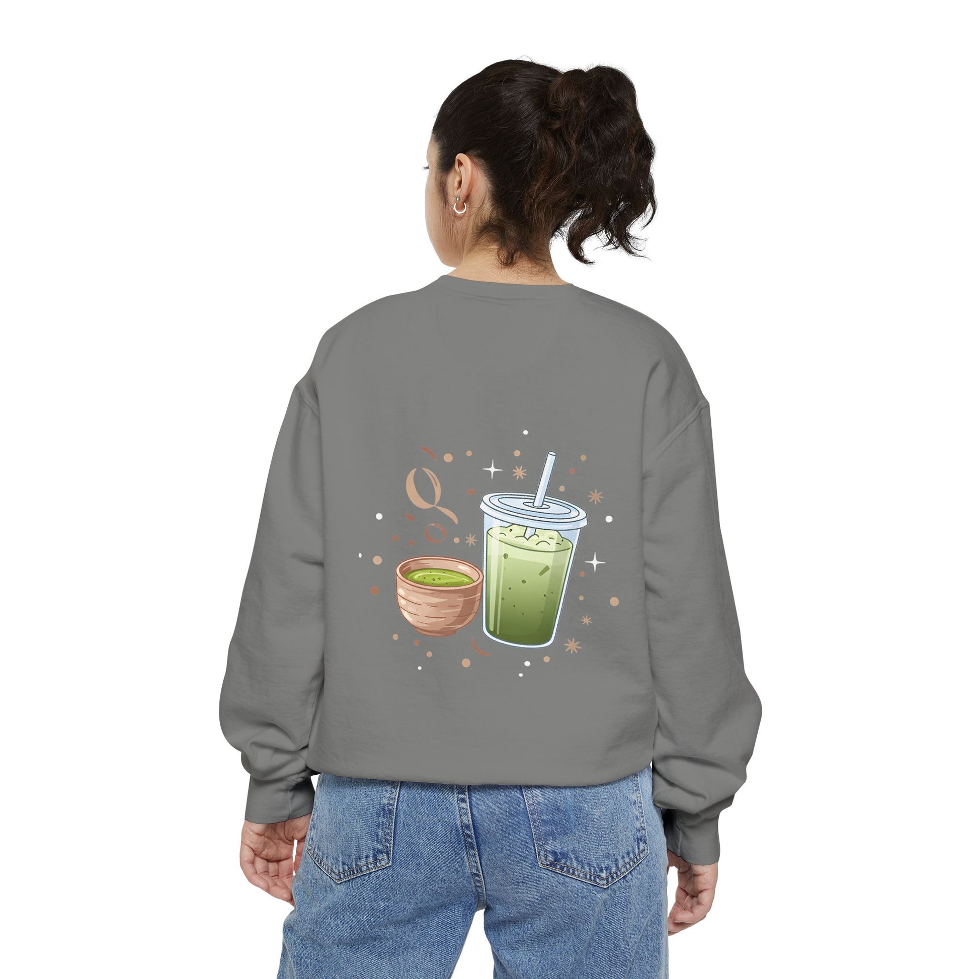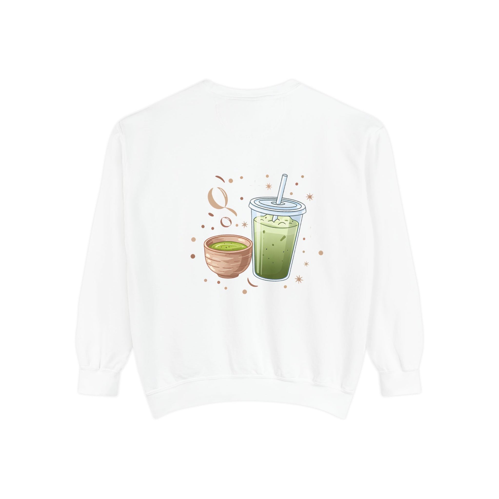 A cozy unisex garment-dyed sweatshirt with the text 'cheers for 2026 - May it be Matchatic' in front and two matcha cups with confetti in the back. Perfect for matcha lovers celebrating the new year. Suitable for adults, this medium-heavy fabric sweatshirt is a relaxed fit with embroidery decoration options.