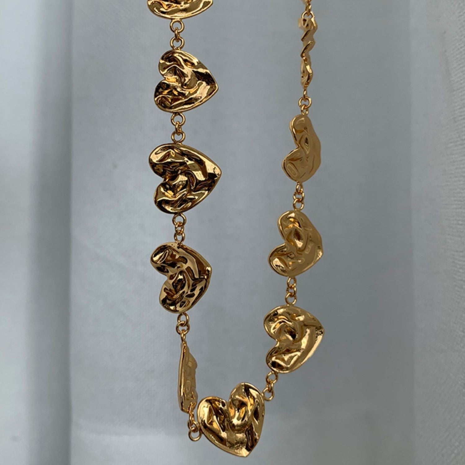 A romantic and playful textured gold necklace designed to highlight the neckline with soft movement and charm. Featuring beautifully crafted heart-shaped and water-drop style charms, this clavicle necklace adds a warm golden glow to both casual and dressed-up looks.