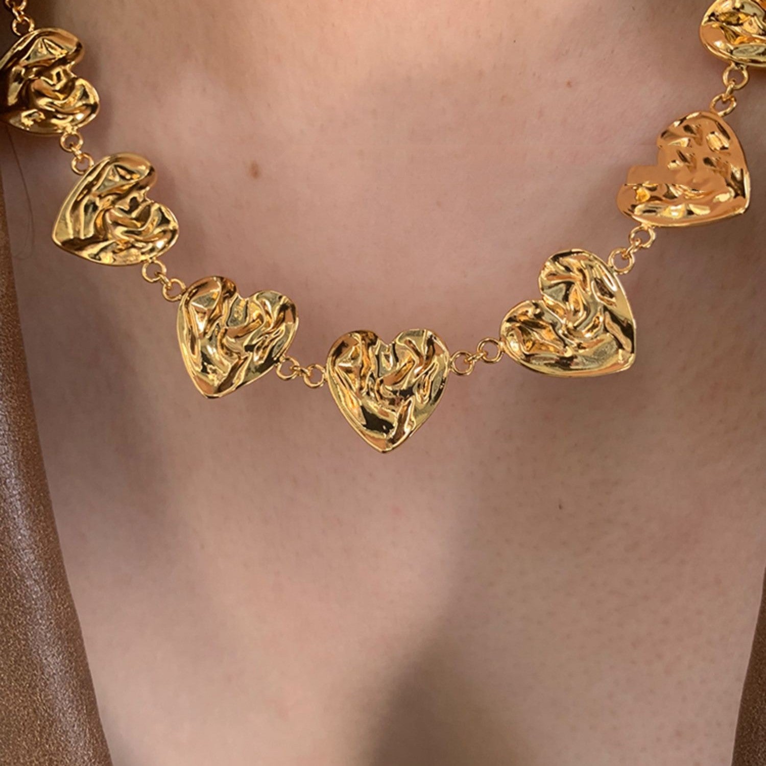 Gold Textured Heart Charm Clavicle Necklace – Elegant Love Chain