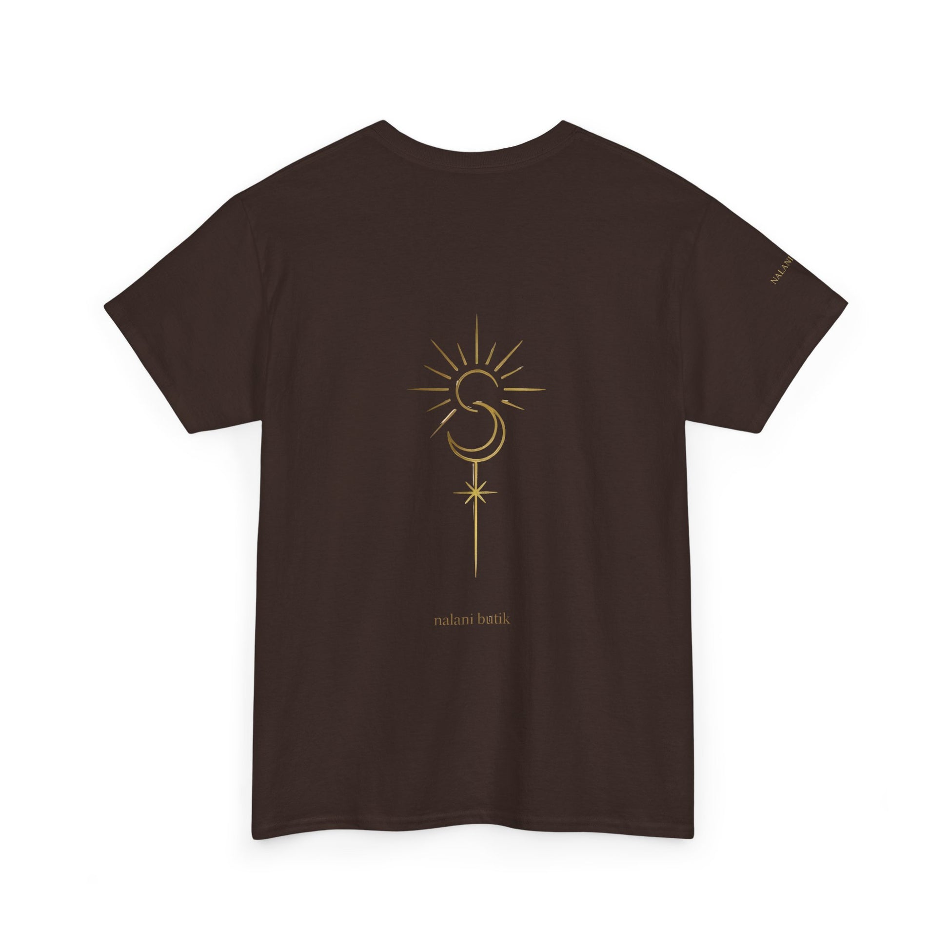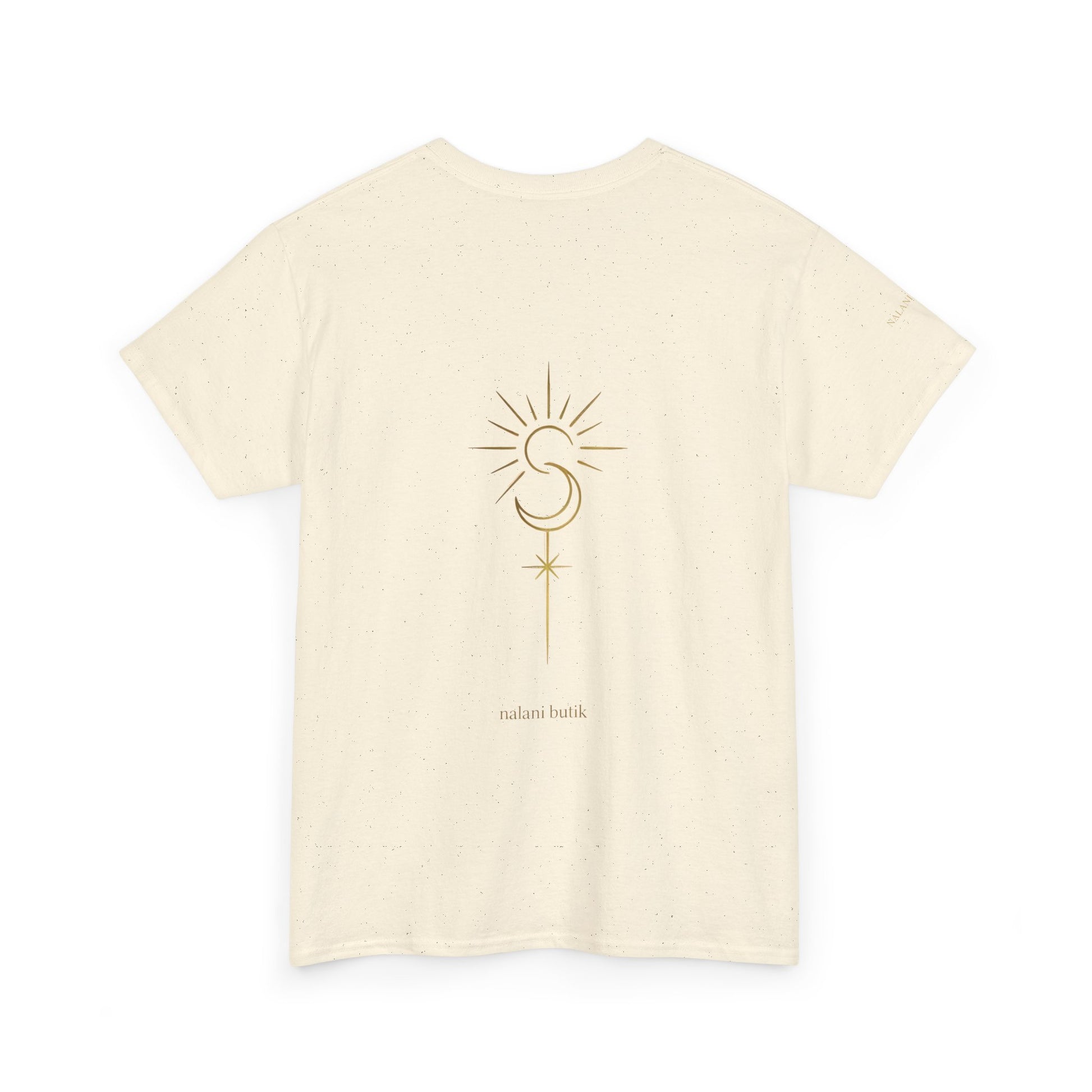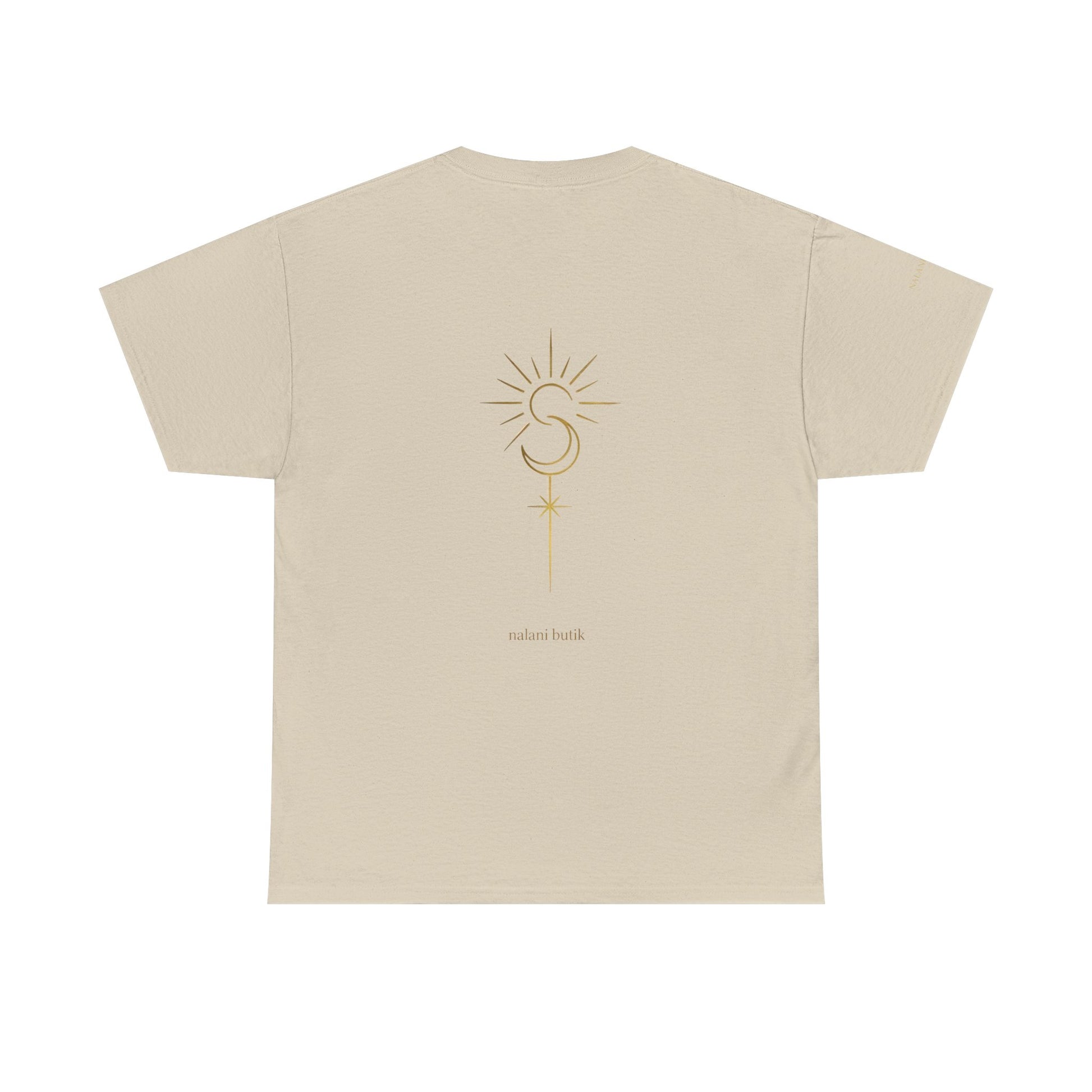 Soft, breathable cotton meets quiet, celestial design. This classic crew tee carries a delicate sun-and-moon emblem printed on the back with a tiny, minimalist mark at the chest. It sits relaxed across the shoulders and hangs with a clean, timeless silhouette — an easy layer for slow mornings, evening walks, or low-key gatherings. The subtle artwork feels personal and contemplative; it’s the kind of shirt you reach for when you want comfort without shouting for attention. Wear it with worn denim, an oversized cardigan, or layered under a jacket for a hint of gentle symbolism that feels like a small reminder to pause and notice light in the ordinary.