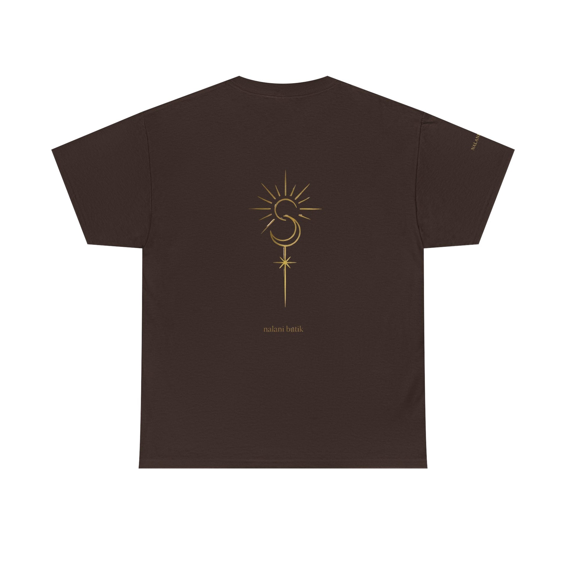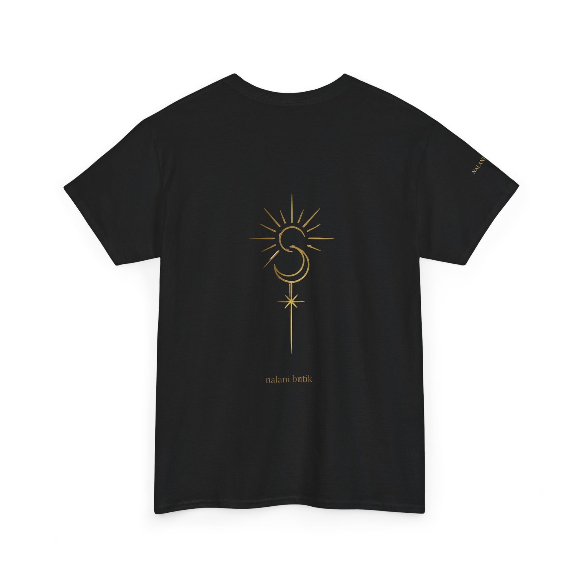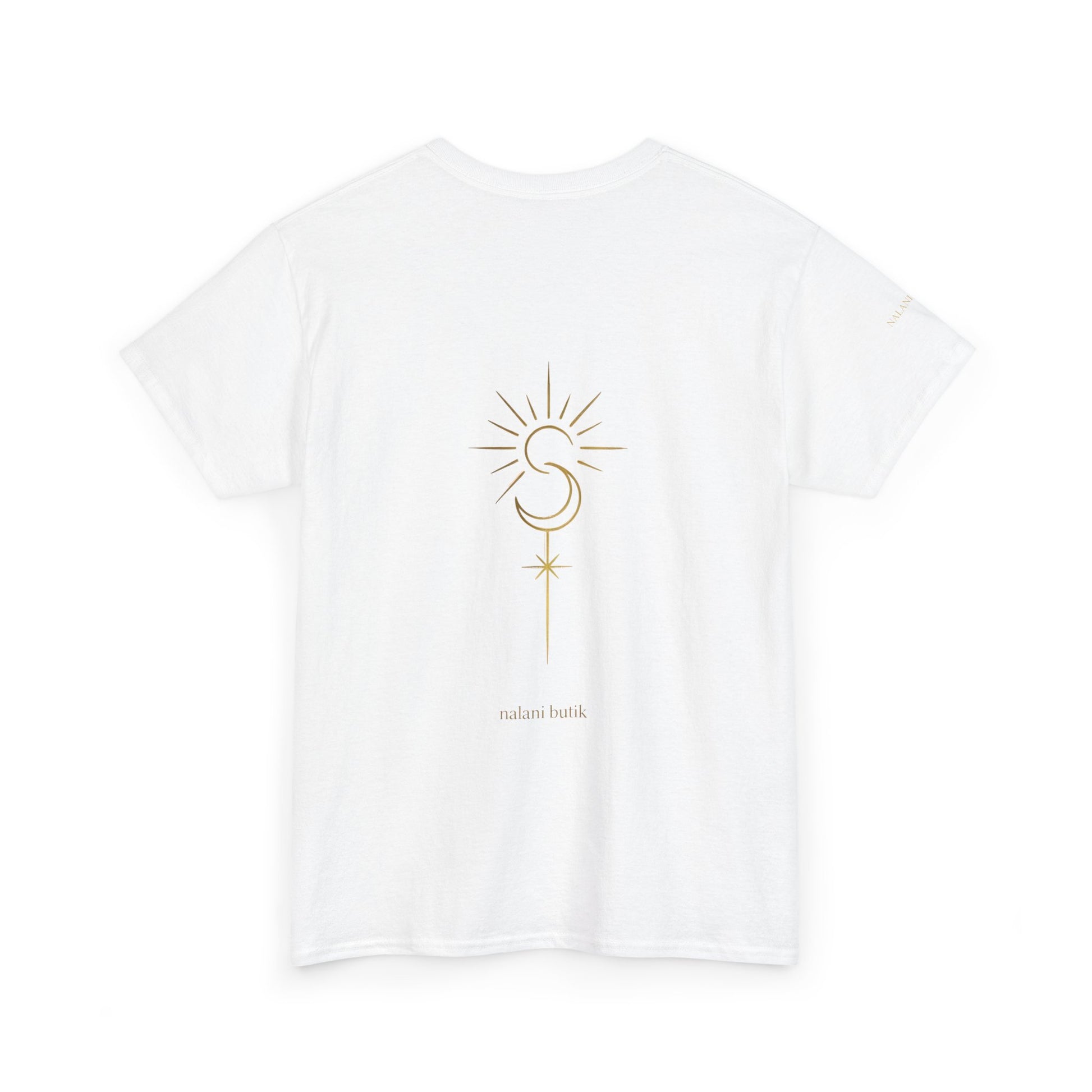 Soft, breathable cotton meets quiet, celestial design. This classic crew tee carries a delicate sun-and-moon emblem printed on the back with a tiny, minimalist mark at the chest. It sits relaxed across the shoulders and hangs with a clean, timeless silhouette — an easy layer for slow mornings, evening walks, or low-key gatherings. The subtle artwork feels personal and contemplative; it’s the kind of shirt you reach for when you want comfort without shouting for attention. Wear it with worn denim, an oversized cardigan, or layered under a jacket for a hint of gentle symbolism that feels like a small reminder to pause and notice light in the ordinary.