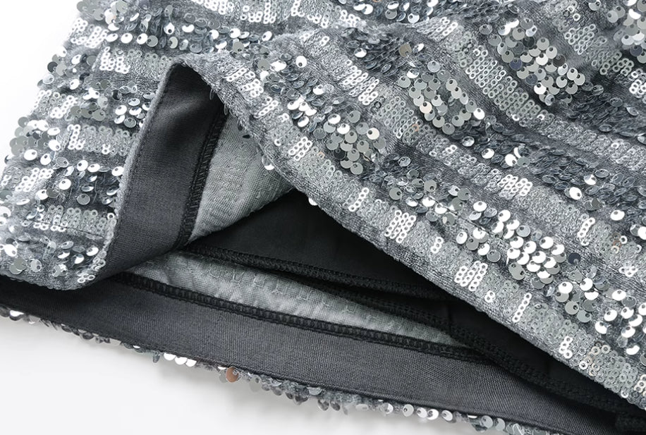 This high-waist A-line skirt is designed with delicate sequins that reflect light softly, creating an elegant glow rather than bold sparkle. Crafted from a cotton-blend fabric with gentle structure, it offers comfort while maintaining a clean, flattering silhouette.