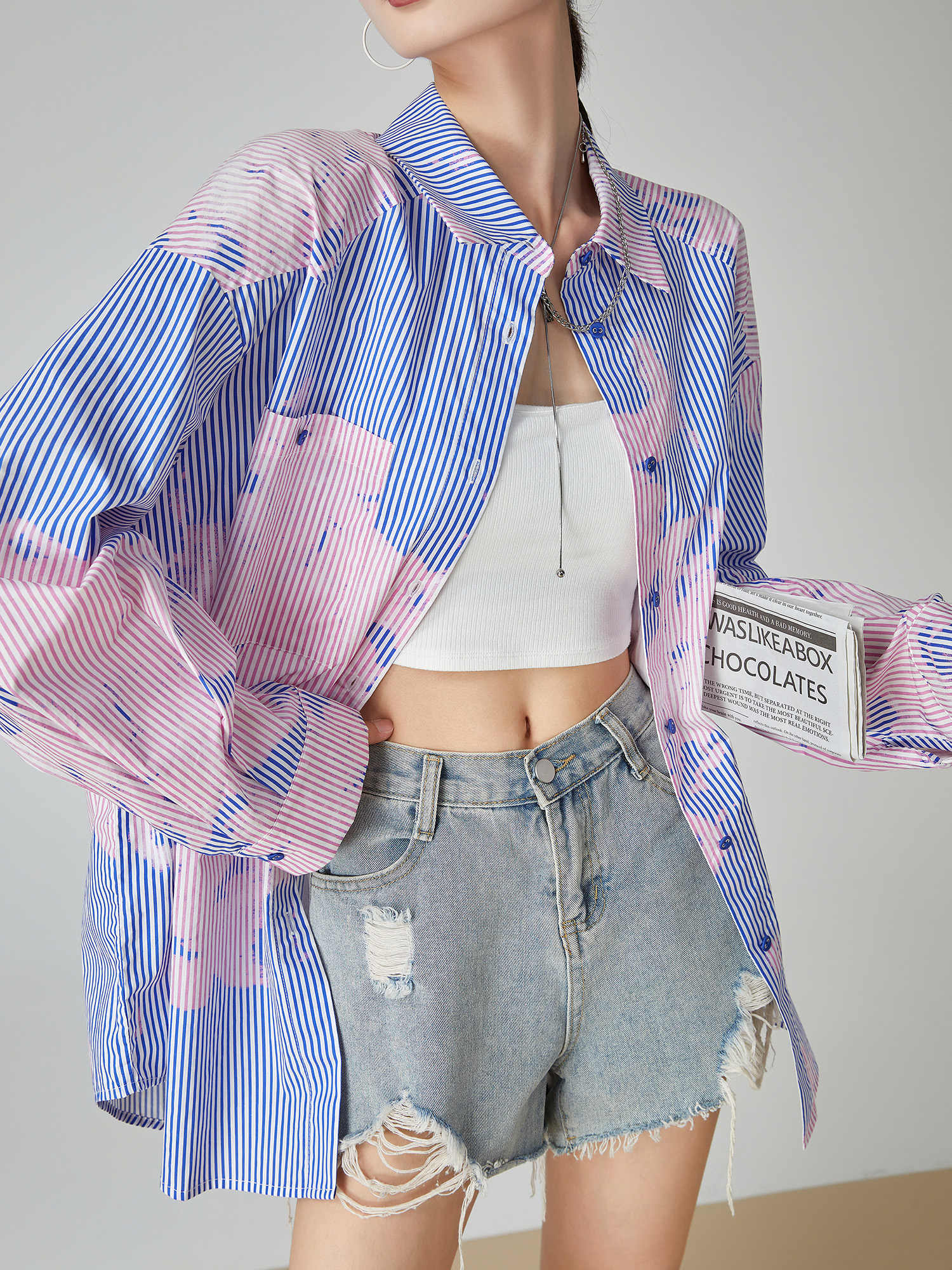 This soft striped shirt features a relaxed fit with a classic collar and long sleeves, creating a timeless silhouette with a modern edge. The gentle mix of blue and pink tones adds subtle character while keeping the look light, fresh, and easy to style.