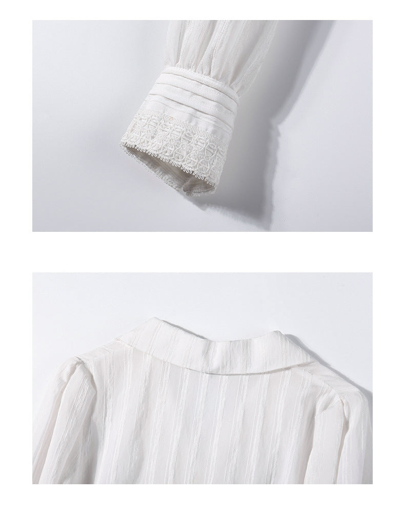 This softly tailored shirt features delicate embroidery and irregular stitching that add depth and character without overwhelming the clean silhouette. The lapel collar and button-front design create a polished yet relaxed look, making it easy to dress up or down.