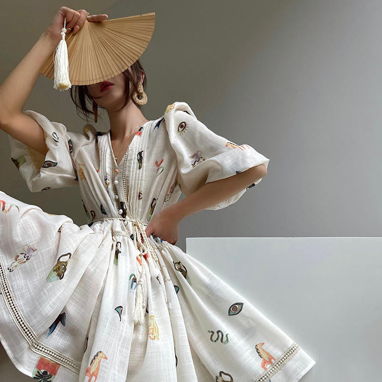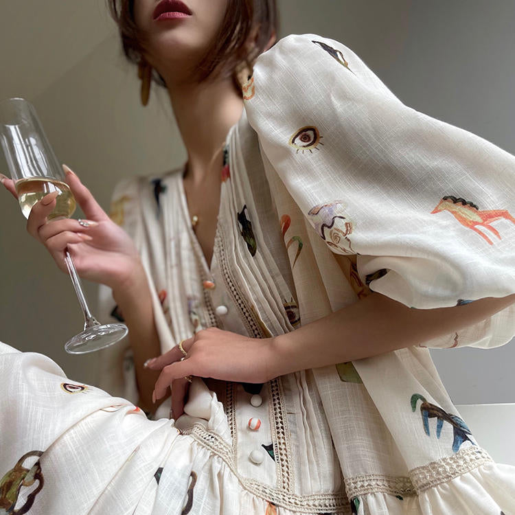 This tea-length dress features a flattering high waist and a gentle V-neckline, paired with softly structured puff sleeves that add light volume and charm. The loose silhouette allows the dress to move freely, creating a relaxed yet feminine shape.